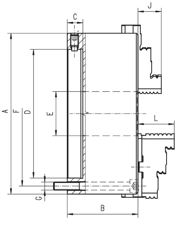 - La pieza sujetada es ajustada a la concentricidad requerida por 4 tornillos radialmente ajustables (8 para los tamaños 16″, 20″ y 25″) .